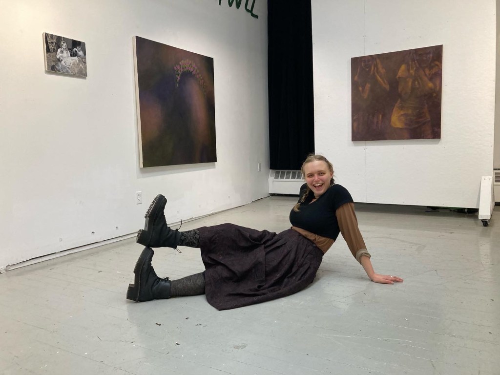 Ineke Knudsen (b. 1996), is a figurative oil painter from Morgantown, WV, currently living and working in Providence, RI. Her work depicts sites of ritual: voluminous mountains and empty plains are pierced by light, and attended to by animals and girls. Heavily influenced by Christian and pagan iconography, Ineke’s creatures morph, circle, and stare, bleeding the lines between animal, human, and god.